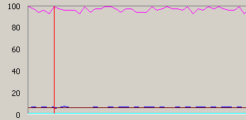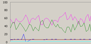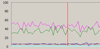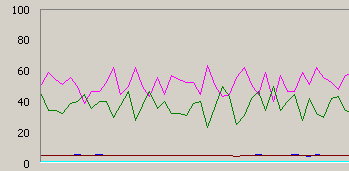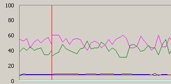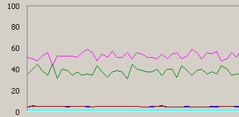Здесь пурпурным цветом обозначена загрузка процессора процессом fbserver/ibserver (в случае Firebird общая загрузка процессора кроме Services API составляет ~97%, для InterBase – 100% во всех случаях), в % от 100, зеленым цветом – загрузка процессора утилитой gbak, а внизу графика синие, черные и коричневые линии – скорость записи-чтения дисков в мегабайтах. Для локального протокола и tcp это в среднем 5.3 мб/сек, а для Services API – 7.3 мб/сек. У InterBase для Services API скорость дискового ввода-вывода для localhost идентична, для локального протокола и Services API – чуть ниже).