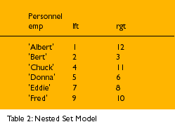 This problem is always given with a column for the employee and one for his boss in the textbooks. This table (Table 2) -- without the lft and rgt columns -- is called the adjacency list model, after the graph theory technique of the same name; the pairs of nodes are adjacent to each other.