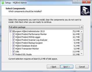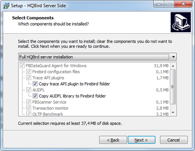 Мы рекомендуем установить все компоненты HQbird, так как они могут оказаться полезными, а занимают очень мало места. Все компоненты устанавливаются в неактивированном виде, и до момента конфигурирования или использования никак не влияют на работу сервера Firebird.