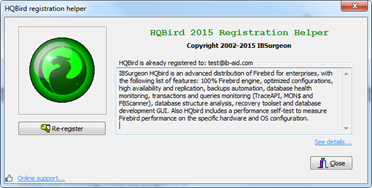 Утилита регистрации может быть вызвана из меню «Пуск» (IBSurgeon\HQbird Admin\Register HQbird), и выглядит примерно так: