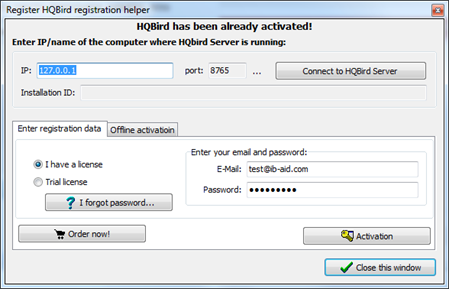 После этого HQbird необходимо активировать (см. раздел