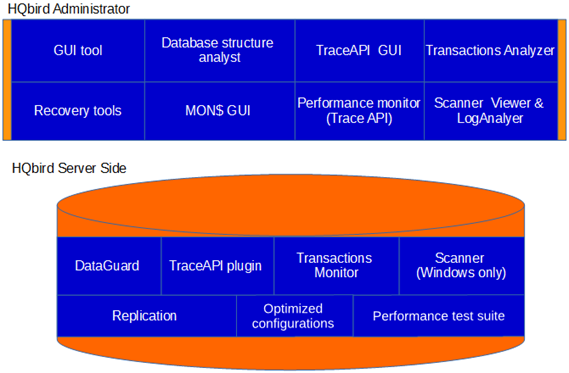 В модулях HQbird можно выделить составные части, выполняющие определенные функции (такие, как резервное копирование, мониторинг, починка баз данных).